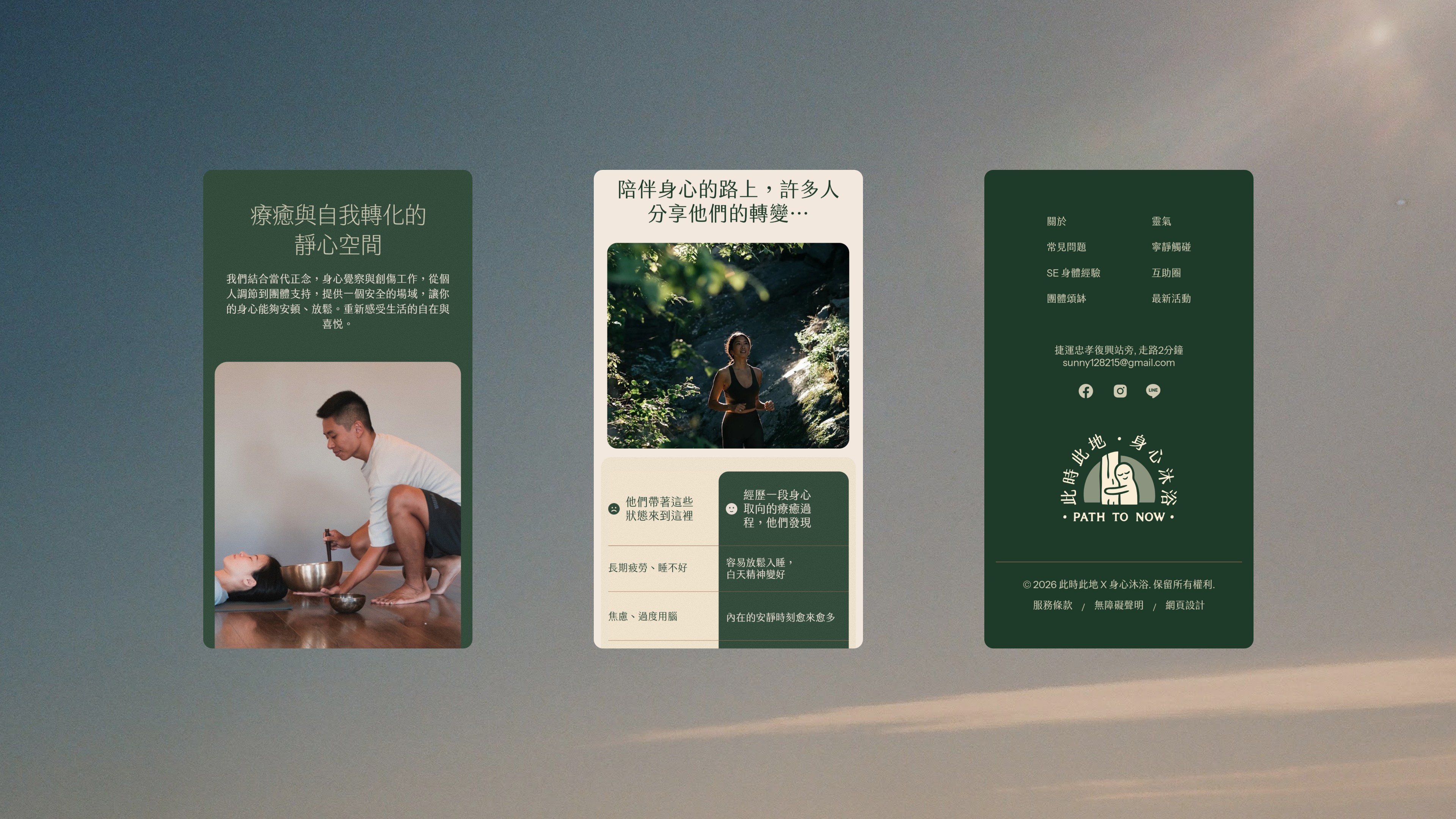 Nestled within the constant motion of Taipei, Path to Now is an alternative healing studio offering a gentle reset for busy urban lives. Through support groups, classes, and one-on-one sessions, the studio helps individuals cultivate a healthier relationship with themselves and those around them. I partnered closely with founder Sunny to lead brand strategy, visual identity, and the design and development of the website. Together, we repositioned the studio from a tool-driven practice to a facilitator-led, nervous-system informed approach rooted in Sunny’s lived experience navigating depression. Inspired by shinrin-yoku and the therapeutic ritual of tree embracing, I created a Tree-Hugging Figure that captures the feeling of being held and grounded. Paired with softened, organic typography, the identity balances calm and playfulness, building trust while steadily growing engagement and visibility.